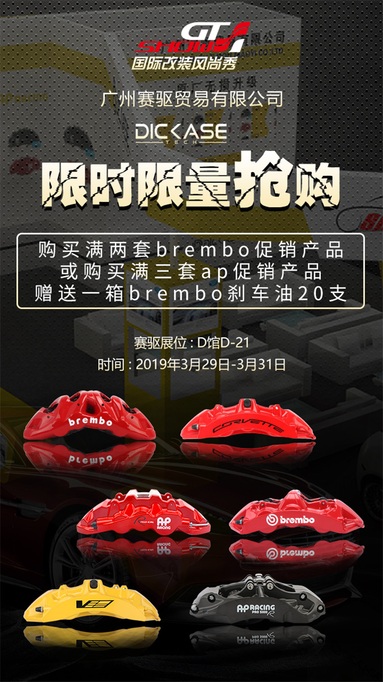2019 GT SHOW,廣州賽驅攜APbrembo兩大高端明星產品和熱銷DICASE新品出席。